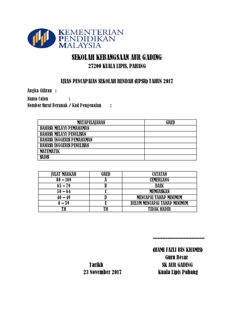 Di sini kami kongsikan koleksi soalan UPSR terdahulu bahan rujukan nota dan panduan dengan harapan ianya akan dapat sedikit sebanyak membantu pelajar dan pengguna menghadapi peperiksaan UPSR nanti. Salam saya telah menghilangkan sijil upsr dan sijil pmr saya tak tuntut dari sekolah lama saya. Gred Markah Spm 2017 Mengikut Subjek.