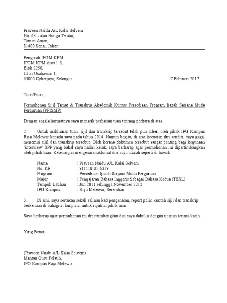 Permohonan Transkrip dan Surat Pengesahan Pelajar. Admin dari blog Contoh Seputar Surat 2019 juga mengumpulkan gambar-gambar lainnya terkait contoh surat permohonan penggantian ijazah yang hilang dibawah ini. Permohonan untuk penggantian sijildiplomaijazah IPG hendaklah dikemukakan kepada Rektor IPGM.
